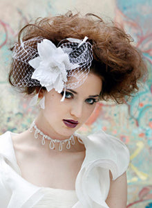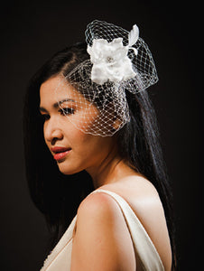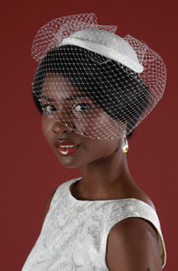 Bridal Cap with Birdcage Veiling and Pouf with Crystal Edging