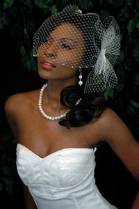 Pearl Bandeau birdcage veils with Birdcage Pouf Netting with Hand beaded Knotted and Draped Pearl Accent